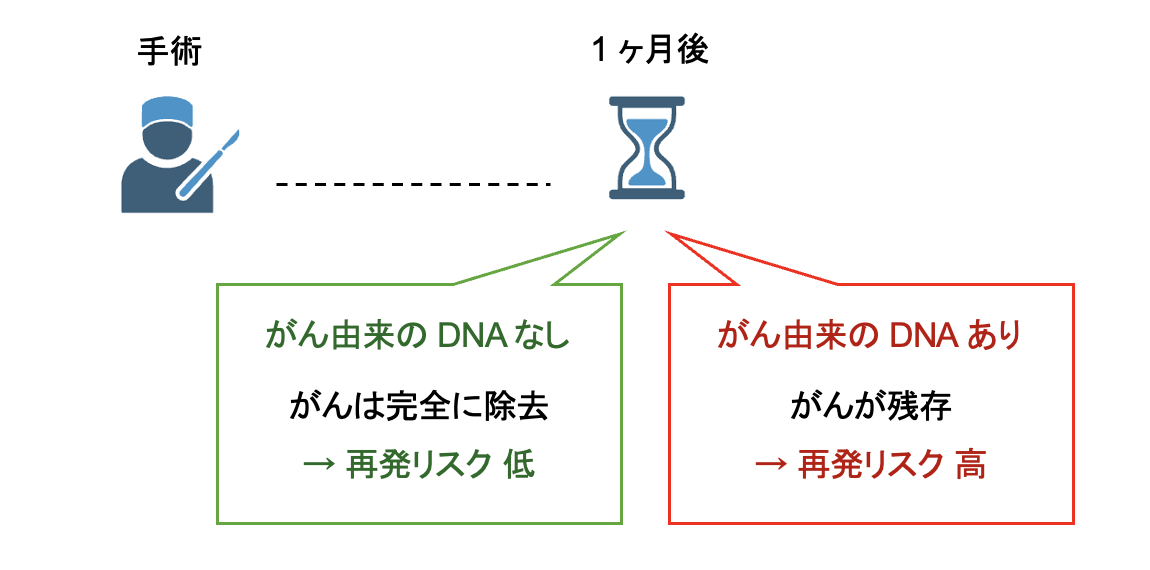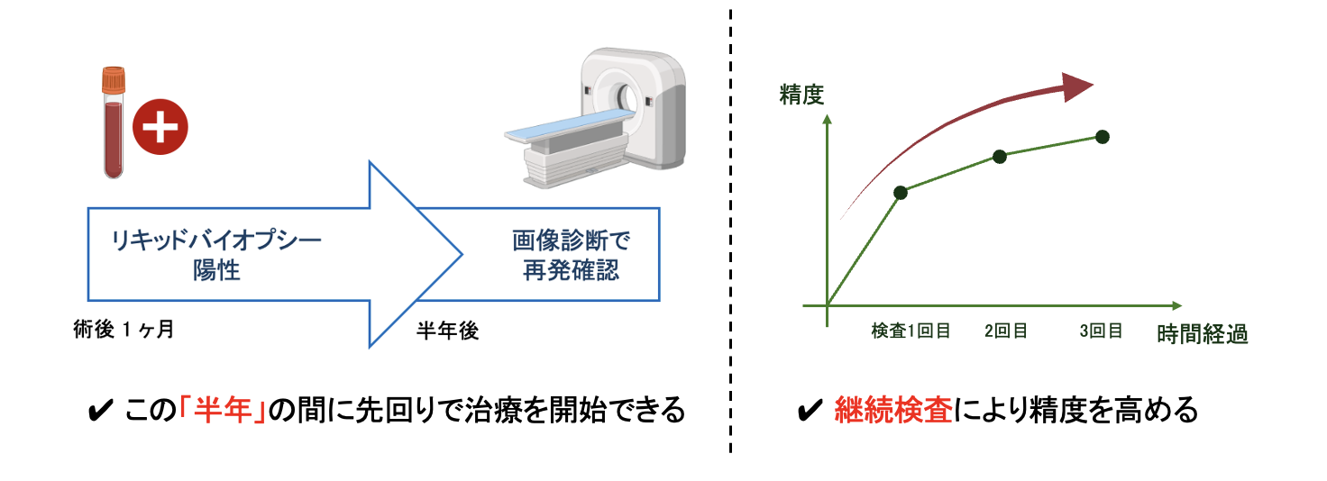 中村:もちろん、術後1ヶ月の検査だけですべてが決まるわけではありません。1回だけでは見逃してしまう小さながんも、数ヶ月おきに繰り返し検査を行うことで、捉えられる確率が格段に上がることがわかっています。 単発では完璧な検査ではなくとも、時系列で確認し続けることで、限りなく完璧に近い精度で再発を予測できるようになります。