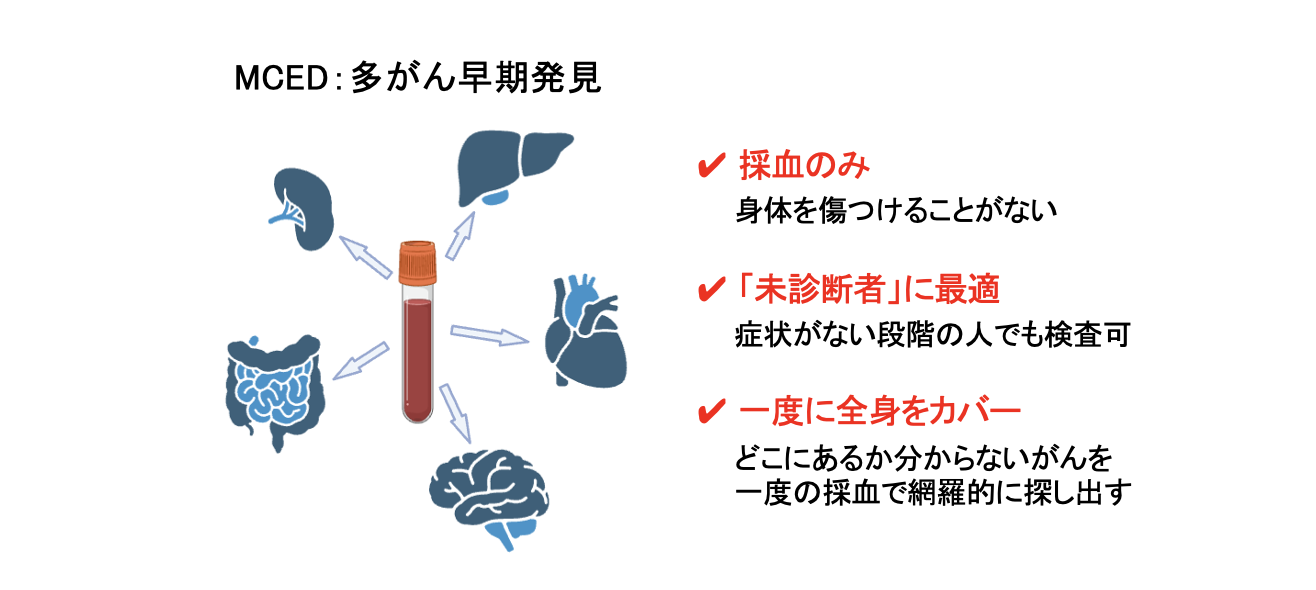 中村:リキッドバイオプシーは、がんの「早期発見」の分野でも研究が急速に進んでいます。 特に近年注目されているのが、特定のがん1種類だけを調べるのではなく、一度の採血で複数のがんを同時に検査する「MCED(Multi-Cancer Early Detection:多がん早期発見)」というアプローチです。