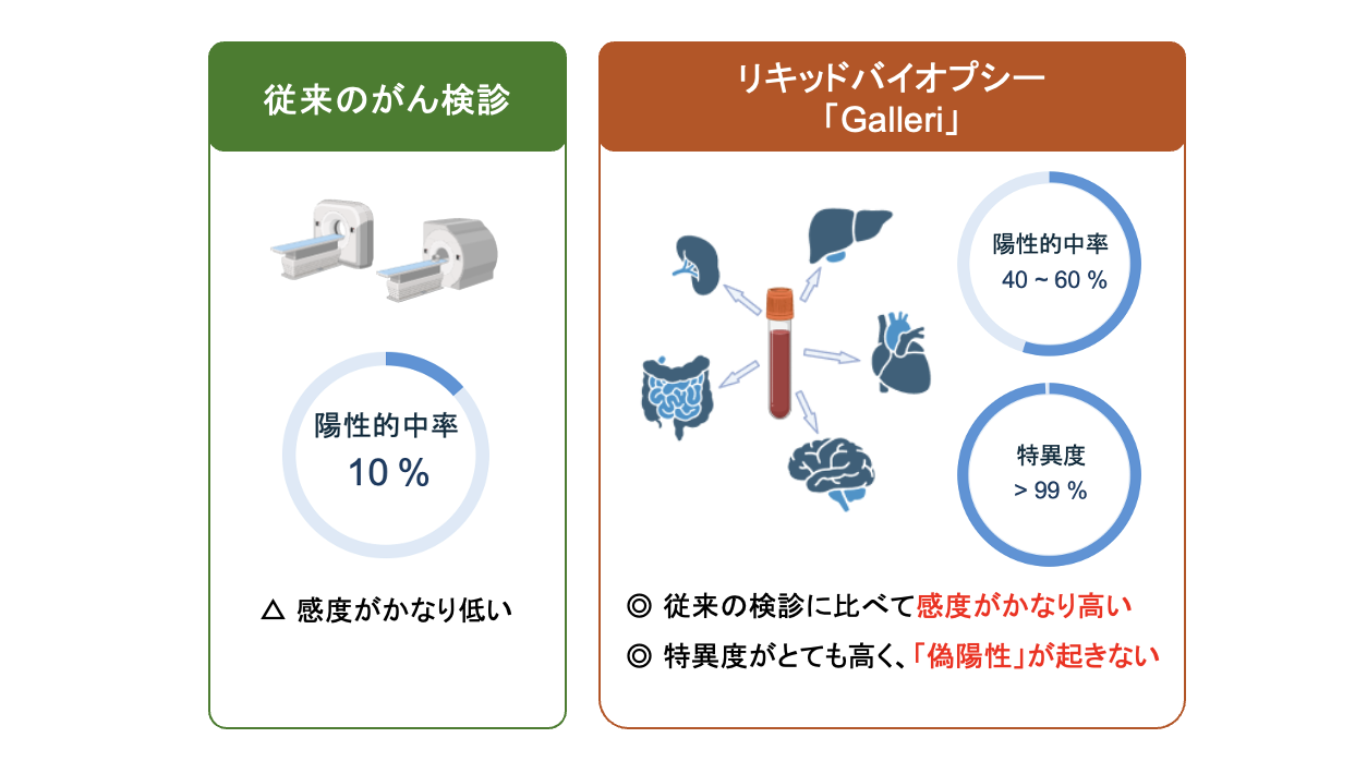 中村:現在、米国の GRAIL 社が開発している「Galleri」という検査では、「陽性(がんの疑いあり)」と判定された人のうち、実際にがんが見つかった人の割合(陽性的中率)は 40 ~ 60% ほどだったと報告されています(※4,5)。 「半分も外れるのか」と思われるかもしれませんが、従来のがん検診(便潜血検査やレントゲン検査など)では、陽性と診断されても実際にがんである確率は 10% 未満とされています。これらに比べると、かなり精度の高い検査であることがわかると思います。