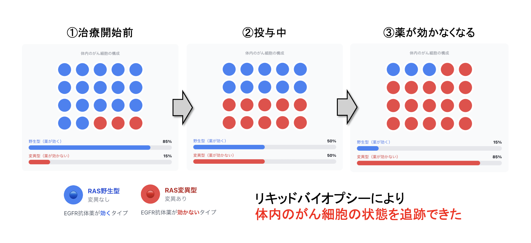 中村: 彼らが患者さんの経過をリキッドバイオプシーで追跡したところ、薬を投与している間は、血液中で「薬の効かないRAS変異型」のがん細胞(由来のDNA)が増加していました。逆に投与を止めると、その変異型が減少することが分かったのです。 つまり、謎だった薬剤耐性の正体は、体内で優勢になるがん細胞が「RAS野生型」から「RAS変異型」へと入れ替わっていたためだと証明されたわけです。